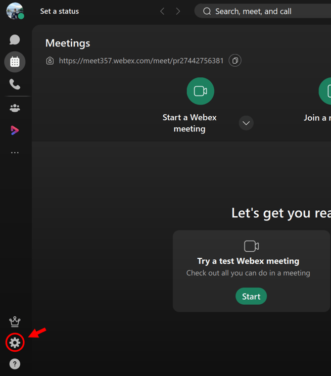 - Open Webex and go to your video settings by clicking on the gear icon in the bottom left corner.
