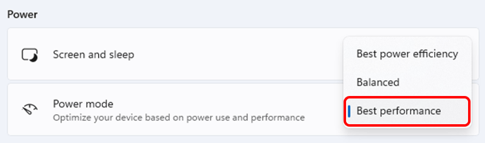 - In the Power mode section, select the Best performance mode from the drop-down menu.