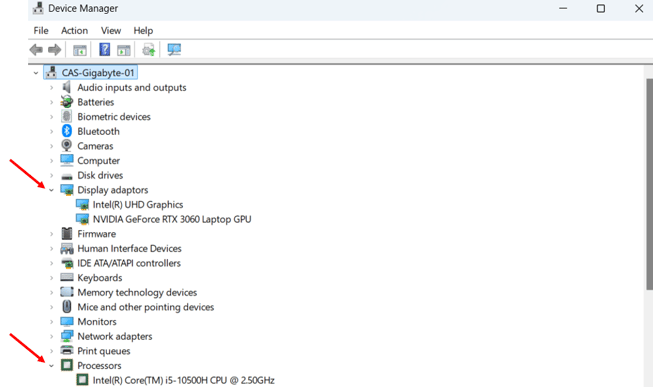 - Expand the Display adaptors and Processors view by clicking on the small arrow on the left-hand side. A screenshot as shown below is sufficient.
