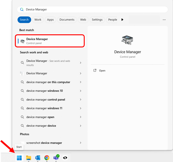 - Click on the Windows icon at the bottom left and type Device Manager in the search bar.