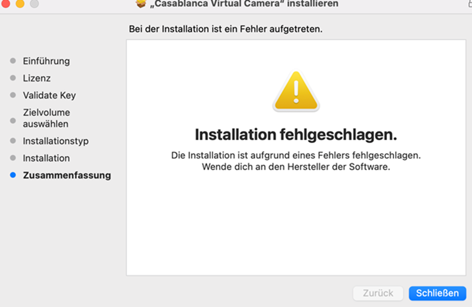 cat /private/var/log/install.log | grep "Casablanca Virtual Camera Installation Log" -A 1000 > Desktop/installer.log - Dies sollte eine Datei namens "installer.log" auf deinem Desktop erstellen. Wenn du uns diese Datei schickst, können wir versuchen, die Ursache des Problems zu finden.