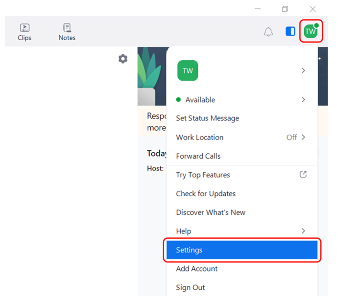 - Öffne Zoom und rufe deine Videoeinstellungen auf, indem du auf deine Initialen in der Ecke oben rechts klickst.