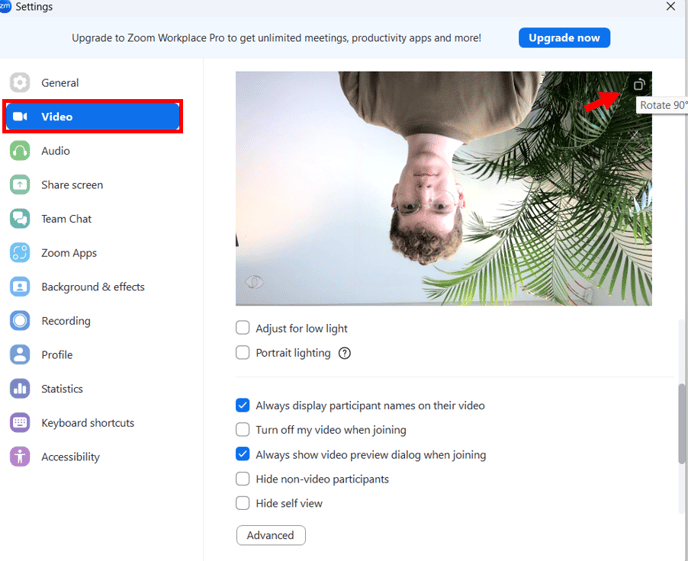 Um dein gedrehtes Bild zu korrigieren, öffnen die Zoom-Videoeinstellungen und klicke auf das Drehen-Symbol in der Kameravorschau, oder verwende die Casablanca-eigene Flip-Video-Funktion.