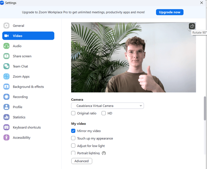 Wenn du die Casablanca Virtual Camera auswählst, kann es manchmal dazu kommen, dass Zoom dein Bild um 90° oder 180° dreht. In diesem Artikel erfährst du zwei Wege, wie du dieses Problem schnell und einfach beheben kannst.